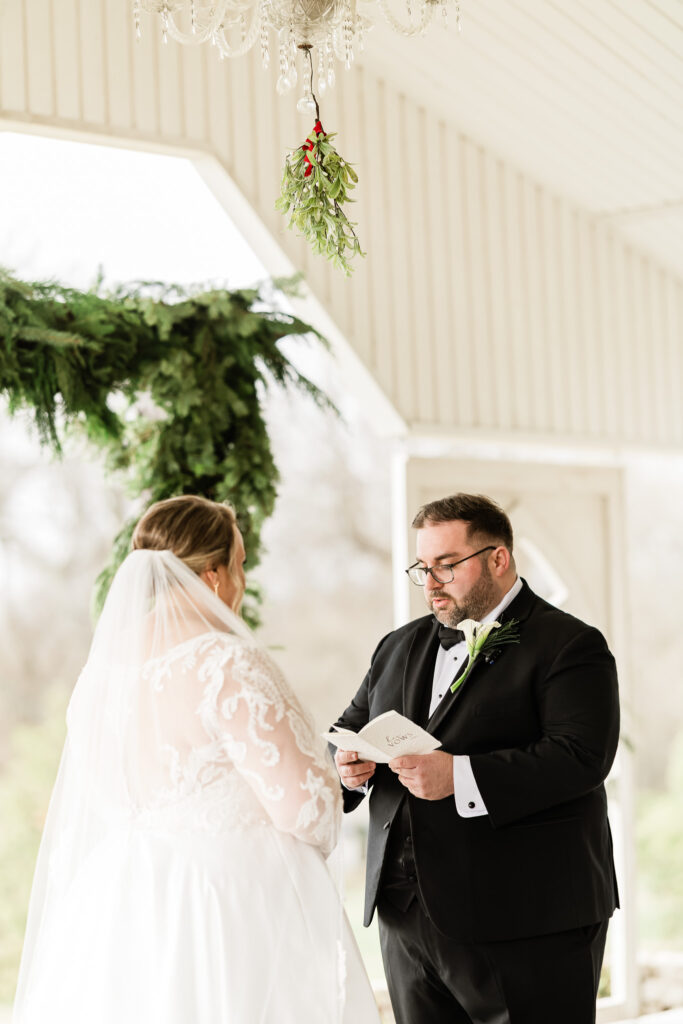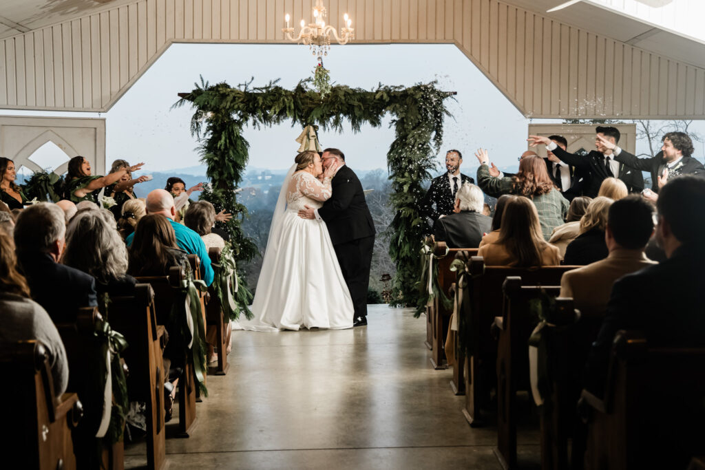 The ceremony was held at Barn in the Bend’s hilltop chapel, with an aisle flanked by lush winter greenery and a garland-draped arbor framing the stunning Tennessee hills. The moment the doors opened for Emmie’s walk down the aisle was unforgettable, topped only by the surprise snow thrown during the couple’s first kiss as husband and wife.