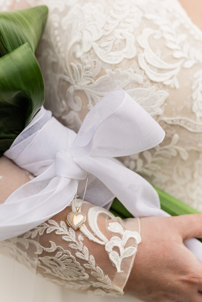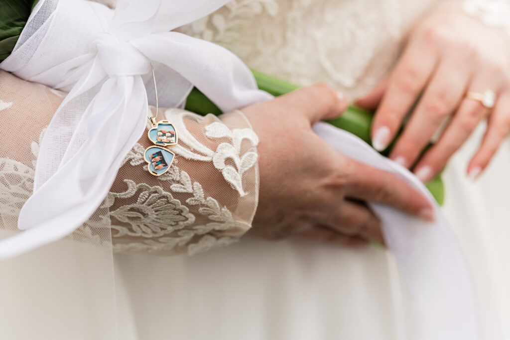 Emmie’s garter was lovingly handmade by her mom’s best friend using pearls from her mother’s bouquet, buttons from her grandmother, and a blue “E” from a cherished late friend’s dish towel. These meaningful keepsakes were tucked near her heart.