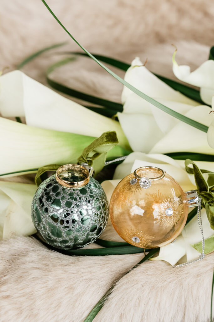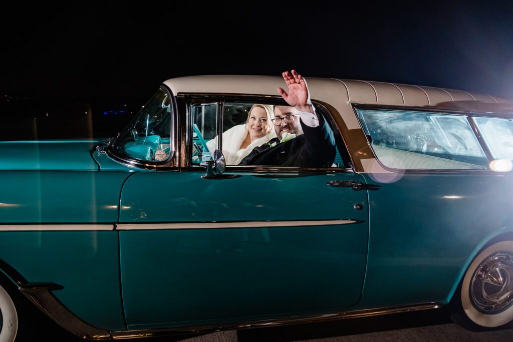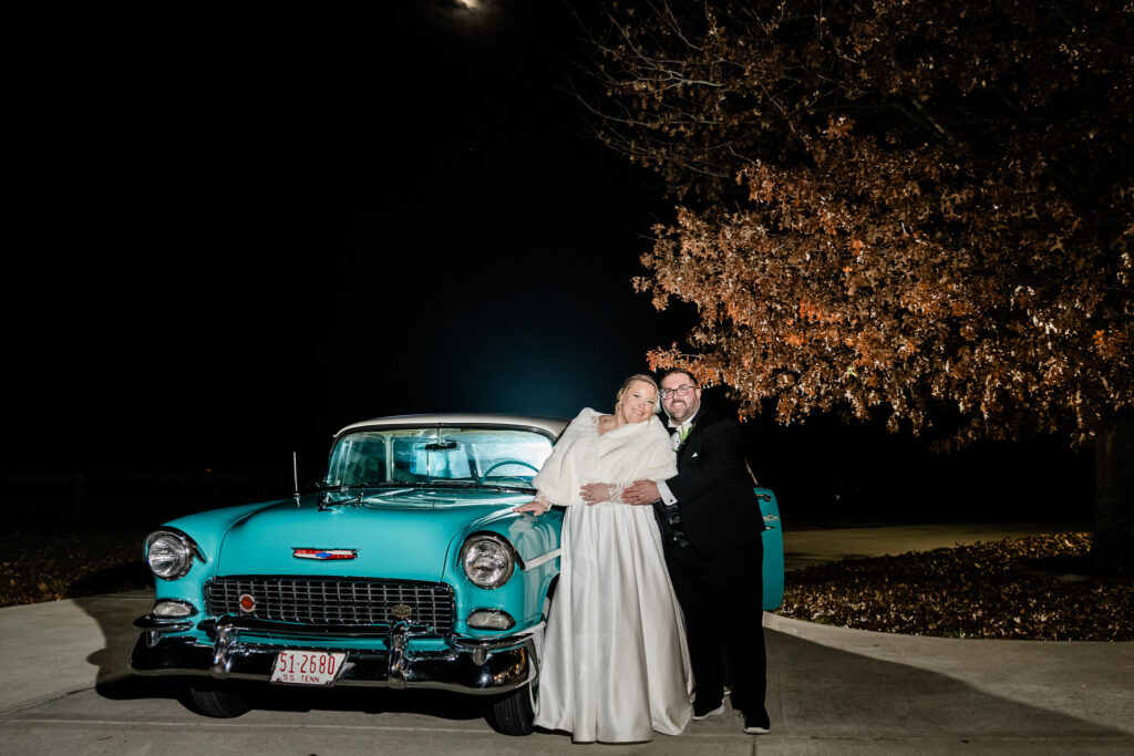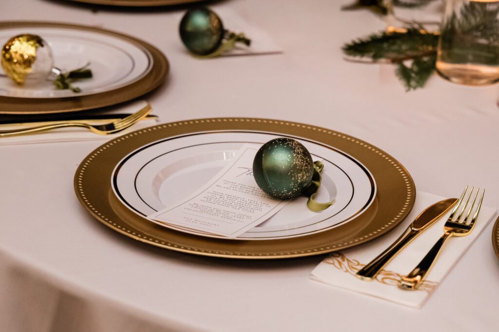 Inside the reception barn, every table sparkled with elegant place settings, gold chargers, and Christmas ornaments as favors. Pine garlands and candlelight added a cozy glow, while a vintage car awaited the couple’s send-off kiss under a canopy of gold streamer wands.